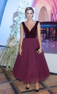 Małgorzata Socha na tę szczególną okazję włożyła szytą na zamówienie suknię wieczorową w oszałamiającym bordowym kolorze, okrzykniętym kolorem sezonu. Umiejętnie skomponowana forma podkreśliła atuty zgrabnej aktorki. Jedwabny tiul zestawiony z jedwanym welurem stworzyły projekt zapierający dech w piersiach.