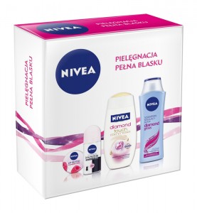 Szampon NIVEA Diamond Gloss 250ml, żel pod prysznic NIVEA Diamond Touch 250ml, dezodorant NIVEA Invisible Black&White roll-on, balsam do ust NIVEA Raspberry Rose.