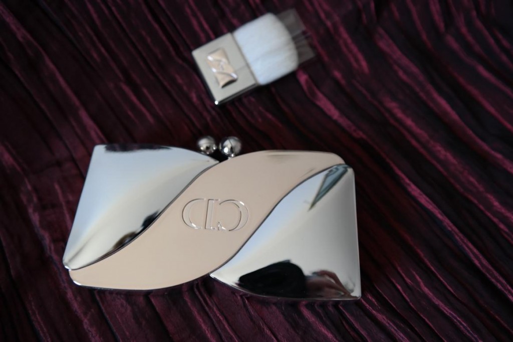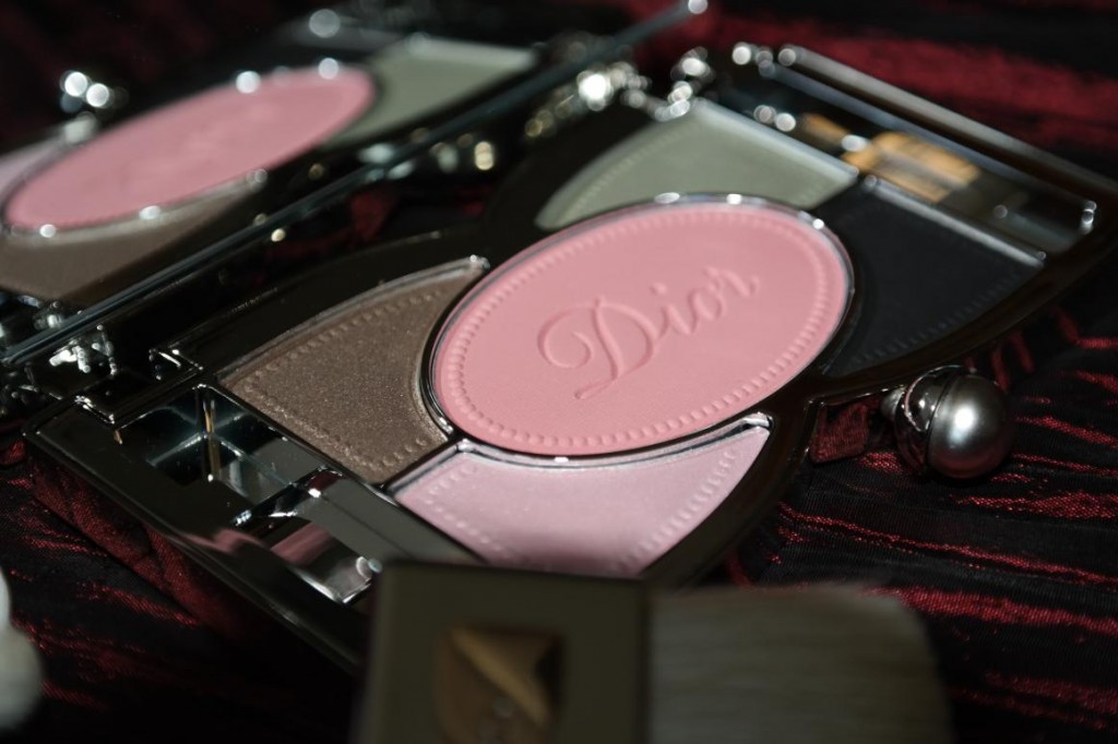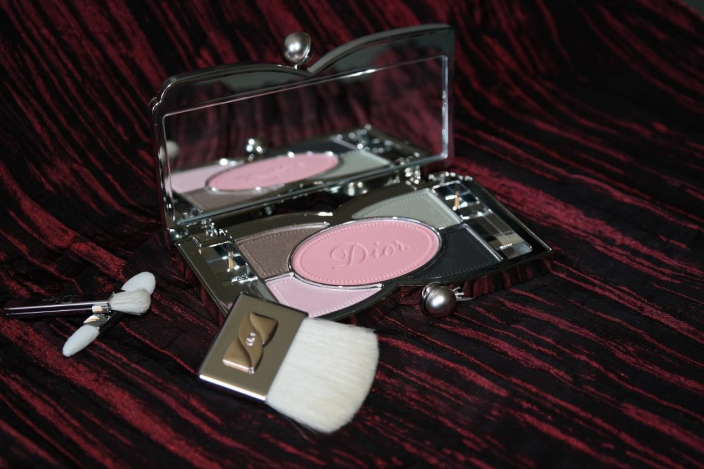 Największe wrażenie zrobiło dla mnie opakowanie ceni – srebrne pudełeczko stylizowane na portmonetkę, zapakowane w szare, aksamitne etui z kieszonką na pędzelek do różu. Dior zadbał o szczegóły. Stylowe pudełeczko, inspirowane czasami Marii Antoniny, zawiera cztery cienie oraz róż, dodatkowo lusterko, pędzelki do różu i cieni.