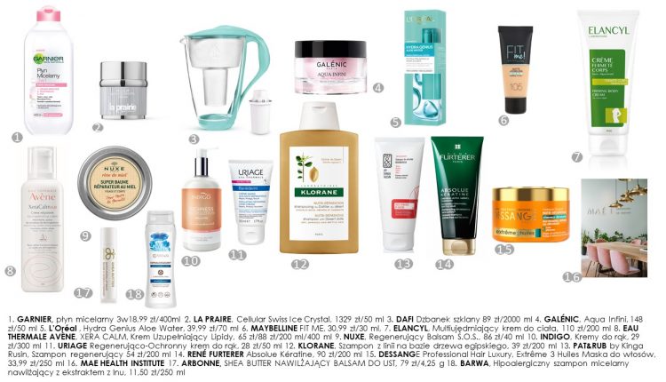 Proponowane: Garnier płyn micelarny 3w1, 18,99 zł/400ml, La Praire, krem Cellular Swiss Ice Crystal, 1329 zł/50 ml, Dafi Dzbanek szklany 89 zł/2000 ml, Galénic, Aqua Infini, 148 zł/50 ml, LOréal Paris, Hydra Genius Aloe Water, 39,99 zł/70 ml, Maybelline New York Fit Me, 30,99 zł/30 ml