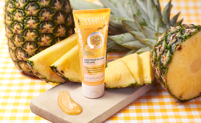Eveline Cosmetics proponuje Enzymatyczny peeling gommage 3W1 z serii Facemed+. Skład preparatu oparty jest o enzym z ananasa i kwasy owocowe. Stymulują ona proces złuszczania i odnowy naskórka. Ponadto znajdziemy w nim D-panthenol łagodzący i zapobiegający przesuszeniom oraz olejek migdałowy, który przywróci cerze piękny blask. Żelowa formuła kosmetyku łatwo się rozprowadza, aktywnie rozpuszcza zanieczyszczenia i usuwa zrogowaciały naskórek. Po użyciu skóra jest gładka, wyciszona i nawilżona. Zapach ananasa sprawia, że zabieg jest wyjątkowo przyjemny.