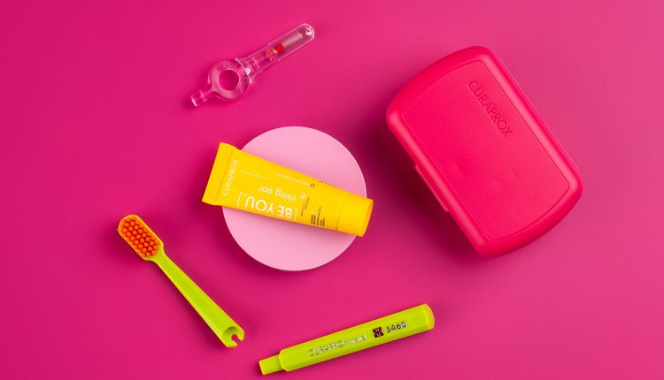 Travel Set od Curaprox dostępny jest aż w sześciu kolorach: niebieskim, zielonym, żółtym, różowym, czerwonym oraz pomarańczowym.