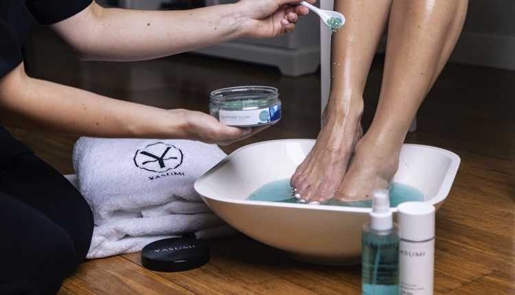 Rytuał Hiru rozpoczyna się od odświeżającej kąpieli stóp z dodatkiem YASUMI Sapphire Glow. Szafirowa i opalizująca sól przywodzi na myśl morskie fale na plaży skąpanej w słońcu. Kąpiel w niej natychmiast przynosi ulgę zmęczonym stopom, poprawia krążenie, oczyszcza i nawilża skórę. Odpręża stopy, ale także umysł.