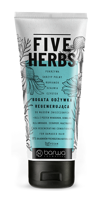Szampon do włosów Barwa Five Herbs Szampon Nawilżający zawiera pięć pachnących ziół oraz ceramidy, niacynamid, skwalan. Dzięki temu delikatnie, ale skutecznie oczyszcza skórę głowy i sprawia, że włosy są nawilżone i wzmocnione. Zaraz po nim sięgnij po Bogatą Odżywkę Regenerującą z olejem z pestek winogron i awokado.