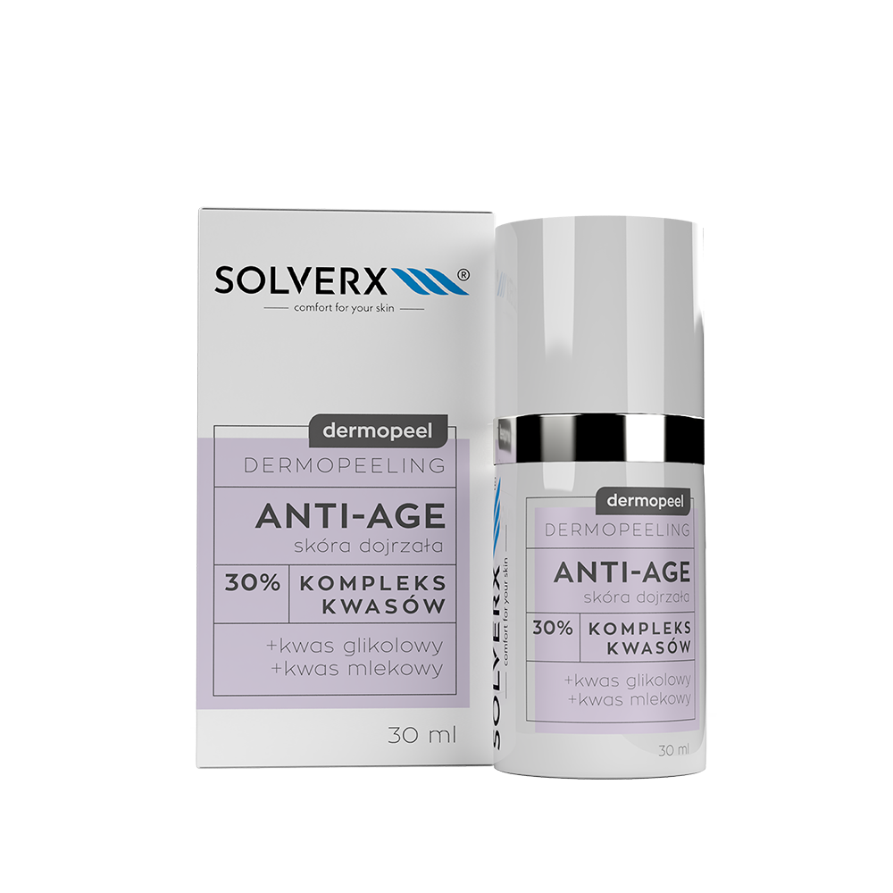 Szczególnie wysoką skuteczność w walce z objawami starzenia wykazują kwasy mlekowy i glikolowy, które idealnie działają w tandemie. Kwas glikolowy spłyca drobne zmarszczki i bruzdy oraz efektywnie złuszcza naskórek. Mlekowy z kolei nie tylko nawilża i złuszcza, ale przede wszystkim jest skutecznym stymulatorem produkcji ceramidów. Zestawienie obu kwasów, stosowane w pielęgnacji domowej bardzo skutecznie działa na cerę wymagającą odmłodzenia. Dzięki dermopeelingowi Anti-Age SOLVERX skóra odzyskuje sprężystość i jędrność. Znacznie mniej widoczne stają się także obawy fotostarzenia.