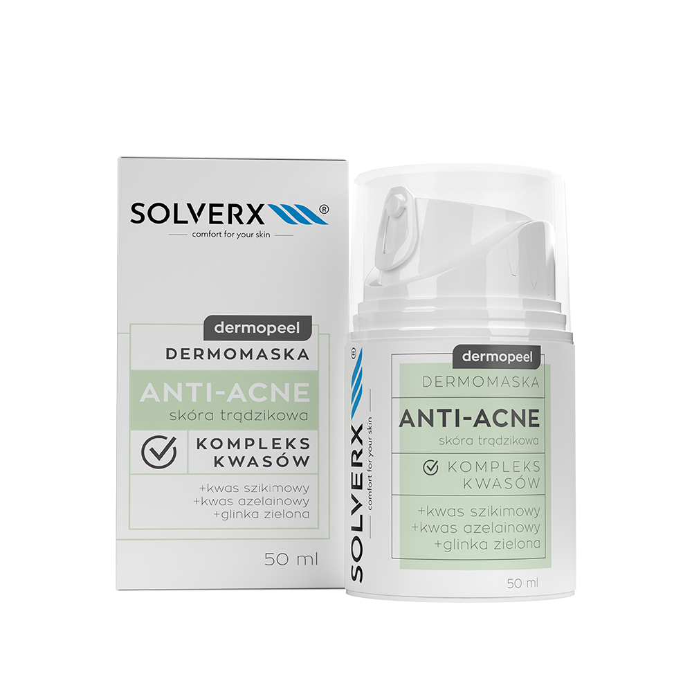 Kwas laktobionowy silnie nawilża, redukuje rozszerzone naczynka oraz skutecznie wzmacnia mechanizmy naprawcze skóry. Z kolei azelainowy – efektywnie łagodzi stany zapalne, reguluje wydzielanie sebum i niweluje rumień. Zawarte w dermopeelingu Anti-Acne SOLVERX połączenie kwasu laktobionowego i azelainowego redukuje zmiany zapalne i odbudowuje naskórek, co jest bezcenne w przypadku cery trądzikowej – mówi Agnieszka Kowalska.