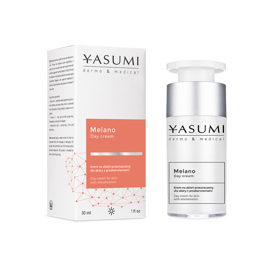 YASUMI Melano Day Cream – wodoodporny, rozjaśniająco-ochronny krem na dzień do skóry z przebarwieniami i oznakami fotostarzenia. Wyrównuje koloryt skóry, rozjaśnia przebarwienia, zapobiega powstawaniu nowych, chroni przed szkodliwym działaniem promieniowania UVB, UVA i IR. Zmniejsza widoczność zmarszczek, poprawia jędrność skóry.