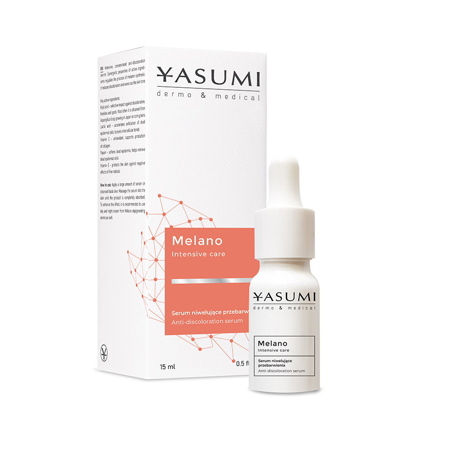 YASUMI Melano Intensive Care – rozjaśniająco-ochronne serum do skóry z przebarwieniami i oznakami fotostarzenia. Stosowane codziennie pod krem rozjaśnia i wyrównuje koloryt skóry, nawilża, ujędrnia, uelastycznia i wygładza, dzięki czemu twarz wygląda zdrowiej, młodziej, promienniej.