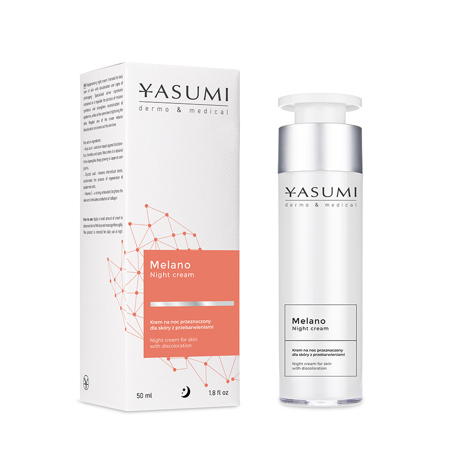 YASUMI Melano Night Cream – rozjaśniająco-ochronny krem na noc dla skóry z przebarwieniami i oznakami fotostarzenia. Redukuje przebarwienia. Reguluje proces syntezy melaniny, rozświetla skórę i stymuluje ją do regeneracji. Chroni przed fotostarzeniem, wygładza i poprawia elastyczność.