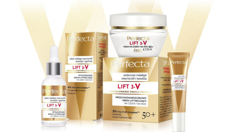 Utrata jędrności w okolicy żuchwy, opadające policzki i powieki, to pierwsze objawy rozluźniania się włókien kolagenowych. Gdy zaczynamy zauważać zmiany, warto sięgnąć po pielęgnację skoncentrowaną na ujędrnieniu i poprawie elastyczności. We wszystkich produktach PERFECTA LIFT 3-V wykorzystano Trio-V-lift ComplexTM – innowacyjny kompleks składników o potrójnej sile liftingującej. Pozostałe komponenty dobrano tak, by odpowiadały potrzebom skóry w różnym wieku. W kremie przeznaczonych dla skóry po 50. roku życia są to peptydy i kwas hialuronowy, w kremie 60+ – ceramidy i witamina C, a dla skóry po 70-tce – peptydy i kofeina. W serum obok Trio-V-lift ComplexTM znajdziemy kompleks peptydów, elastynę i  skwalan. Dopełnieniem pielęgnacji jest krem na okolice oczu z peptydami, kofeiną i witaminą C.