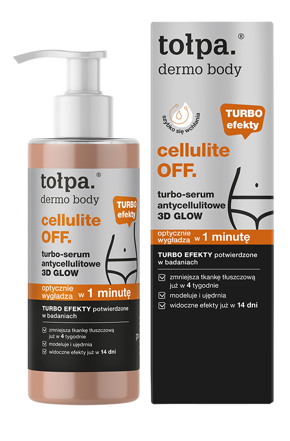 Jeśli potrzebujesz natychmiastowego efektu wow, sięgnij po tołpa. dermo body cellulite OFF turbo-serum antycellulitowe 3D GLOW, 250 ml/62,99 zł, które zapewnia turbo efekty: działa natychmiast i jednocześnie długotrwale. Zaraz po użyciu poprawia wygląd skóry, a dzięki drobinkom odbijającym światło, w 1 minutę optycznie wygładza nierówności. Redukuje cellulit, także ten uporczywy i chroni przed jego nawrotem. Zmniejsza grubość i objętość tkanki tłuszczowej. Eliminuje nadmierne centymetry, wyszczupla i modeluje ciało. Uelastycznia i ujędrnia skórę, silnie wygładza i nawilża. Ma lekką, żelową konsystencję, która szybko się wchłania zapewniając natychmiastowy efekt upiększający.