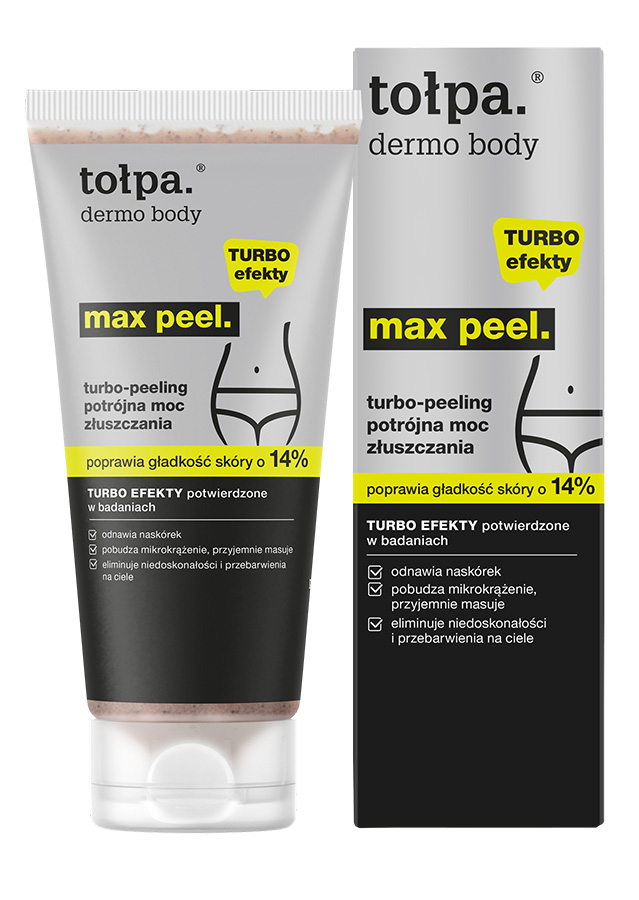 W trakcie bardziej beztroskich dni, nie zapominajmy także o potrzebach skóry ciała, eksponowanego szczególnie w wakacje. Stosuj nawilżanie i regularnie złuszczaj naskórek, a jeśli oczekujesz szybkich rezultatów sięgnij po tołpa. dermo body max peel. turbo-peeling potrójna moc złuszczania, 200 ml/ 44,99 zł. To produkt, który jest turbo peelingiem o potrójnej mocy złuszczania, to znaczy, że maksymalnie i natychmiast wygładza skórę na trzy sposoby: mechanicznie, enzymatycznie i dzięki działaniu kwasów AHA. Intensywnie odnawia usuwając zrogowaciały naskórek. Już po pierwszym użyciu daje efekt turbo gładkiej skóry, a ciału nadaje lekkości. Poprawia elastyczność i chroni przed wiotczeniem. Eliminuje niedoskonałości i przebarwienia na ciele, poprawia koloryt skóry i wydobywa jej naturalny blask. Przyjemnie masuje, pobudza mikrokrążenie i wspomaga eliminację cellulitu. Zapobiega wrastaniu włosków na ciele po depilacji i goleniu oraz przygotowuje skórę do lepszego wchłaniania kosmetyków pielęgnacyjnych.