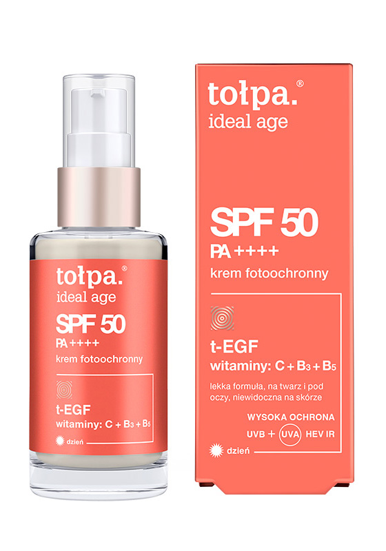 Ochrona przeciwsłoneczna to absolutny must-have każdego dnia, szczególnie latem. Fotoochronny krem tołpa. ideal age SPF 50 skutecznie chroni skórę przed promieniowaniem UV i działa antyoksydacyjnie. Zapewnia fotostabilną ochronę w zakresie promieniowania UVA i UVB, HEV (światło niebieskie), IR (podczerwień). Jednocześnie zapewnia natychmiastową, niewidoczną ochronę przed fotostarzeniem, wolnymi rodnikami i przebarwieniami. Sprawdzi się do skóry wymagającej ochrony przeciwsłonecznej po użyciu produktów z kwasami lub retinoidami. Wykazuje również silne działanie antyoksydacyjne. Krem na dzień o lekkiej, niekomedogennej formule. Nie zawiera substancji zapachowej. Nie jest widoczny na skórze, nie bieli. Idealnie sprawdza się pod makijaż. Produkt odpowiedni dla skóry wrażliwej i alergicznej, również wokół oczu.