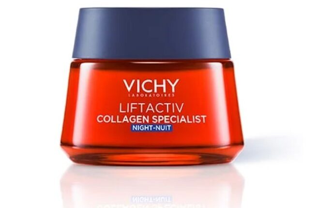 Vichy Liftactiv Collagen Specialist to przeciwzmarszczkowy krem na noc z witaminą Cg i peptydami, który został stworzony, aby w trakcie nocy wzmocnić skórę w walce ze szkodliwymi czynnikami zewnętrznymi oraz korygować uszkodzenia nagromadzone w ciągu dnia. Po 1. miesiącu regularnego stosowania zmarszczki są widocznie zredukowane, a kontur twarzy wymodelowany. Silna formuła bogata jest w składniki aktywne naturalnego pochodzenia. Zawiera witaminę Cg, antyoksydant o działaniu rozświetlającym skórę oraz wyrównującym jej koloryt oraz przeciwstarzeniowe peptydy o właściwościach redukujących oznaki utraty kolagenu w skórze. Formuła wzbogacona jest również o resweratrol, aby przywrócić skórze naturalny blask oraz nasyconą 15 cennymi minerałami wodę wulkaniczną Vichy, która wspiera naturalne mechanizmy obronne skóry.