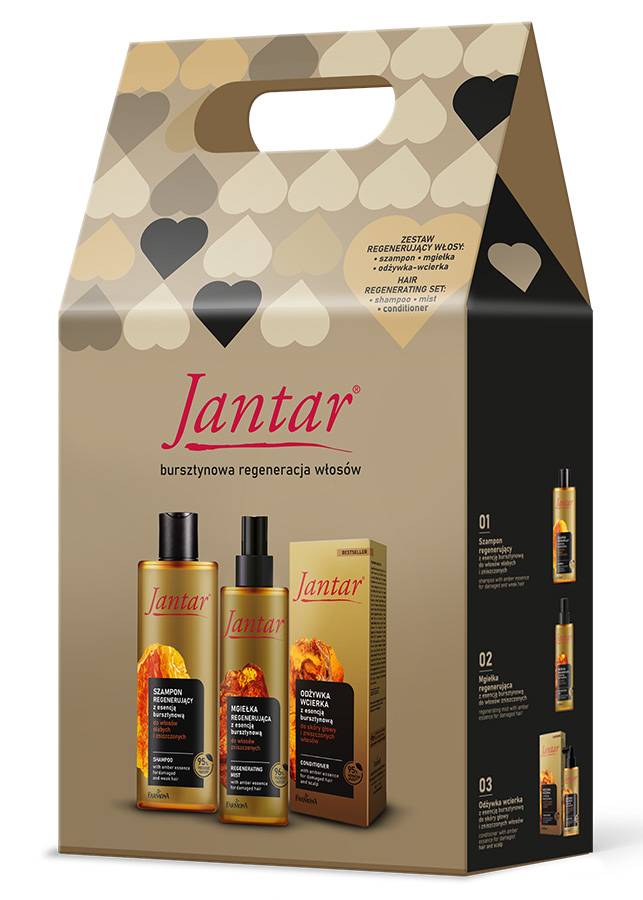 Zestaw został skomponowany z myślą o osobach, których włosy są słabe i zniszczone. Znajdziemy w nim trzy kultowe kosmetyki Jantar: szampon do włosów, polecany do codziennej pielęgnacji, mgiełkę oraz kultową odżywkę-wcierkę. W każdym produkcie zawarto cenną esencję bursztynową, skutecznie regenerującą i rewitalizującą włosy. Szampon za sprawą biotyny, argininy, witamin oraz betainy – wzmacnia i nawilża. Aż 96% Wizażanek* uznało, że pozostawia włosy miękkie w dotyku i zdrowo wyglądające. Mgiełka wygładza, odżywia i chroni przed szkodliwym działaniem czynników zewnętrznych. Odżywka-wcierka nawilża i łagodzi skórę głowy oraz poprawia jej kondycję – potwierdziło to 97% Wizażanek*. Tyle samo zauważyło, że kosmetyk odżywia i wzmacnia włosy. 45,99 zł/ szt.