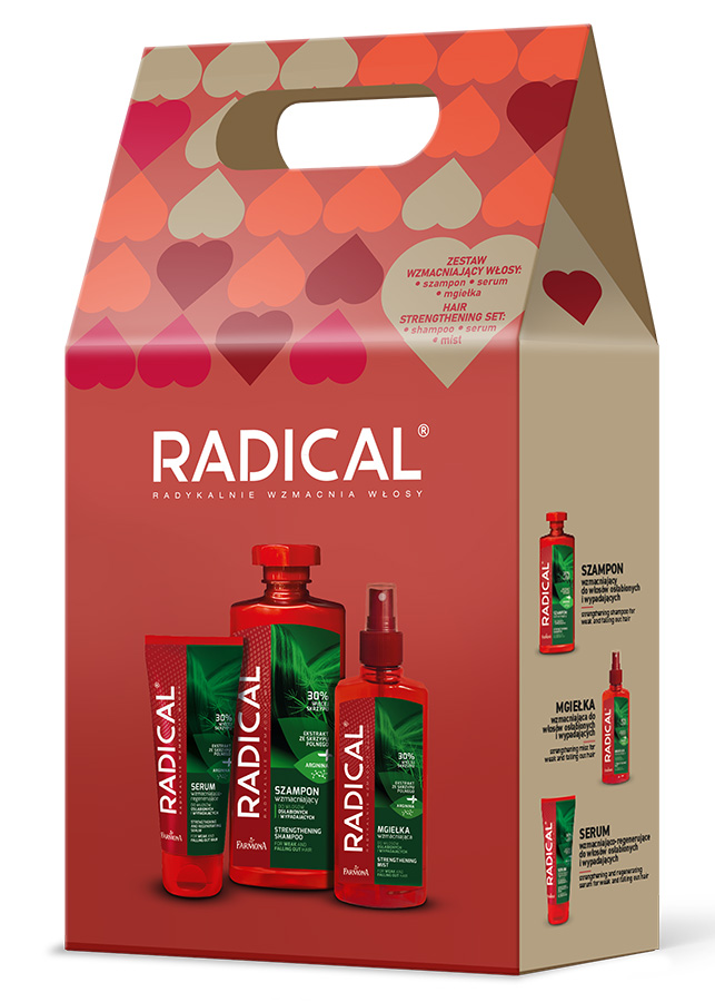 W tym zestawie zawarto trzy kosmetyki do pielęgnacji włosów, których formuły oparte zostały na cenionym od wieków ekstrakcie ze skrzypu polnego oraz argininie. To właśnie dlatego Radical jest doskonałym wyborem dla osób posiadających włosy osłabione i wypadające. Szampon regeneruje ich strukturę i zmniejsza łamliwość. Serum zapewnia dogłębne odżywienie i nawilżenie sprawiając, że włosy stają się aksamitnie miękkie, puszyste i błyszczące. W zestawie znajdziemy również mgiełkę, która skutecznie chroni przed uszkodzeniami, ułatwia rozczesywanie oraz zapewnia im piękny, zdrowy wygląd. 39,99 zł/ szt.