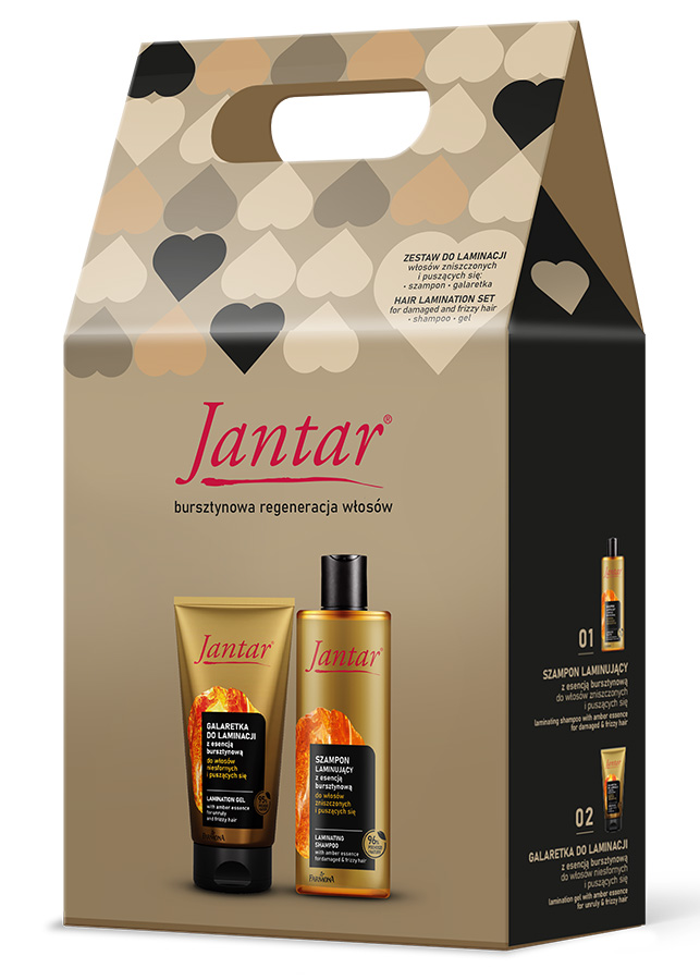 Bursztynowa komnata Jantar odkrywa tajemnicę idealnie gładkich włosów, których siła i piękno płyną z natury. W zestawie zamknięto kosmetyki do laminacji włosów: szampon oraz galaretkę, którą pokochały już rzesze konsumentek. Ich receptury zostały oparte na cennej esencji bursztynowej, która skutecznie odżywia i wzmacnia pasma. Szampon zapewnia delikatne oczyszczenie, a przy tym zapobiega elektryzowaniu się włosów. Natomiast galaretka zapewnia idealną taflę na włosach, nawilża, a przy tym ułatwia stylizację. 42,99 zł/ szt.
