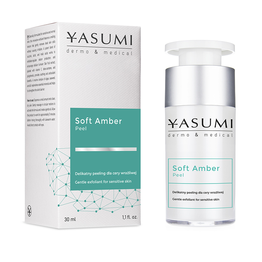 Yasumi Soft Amber Peel – peeling z kwasami do skóry wrażliwej i normalnej. Rozpuszcza martwe komórki naskórka, oczyszcza i odświeża. Nawilża, koi podrażnienia, wygładza, zmiękcza, eliminuje szorstkość, rozświetla, przygotowuje skórę do dalszej pielęgnacji. Zawiera kwas bursztynowy, jabłkowy, mlekowy, cytrynowy, ekstrakt z liści karamboli, alg i kopru. Cena 99 zł/30 ml