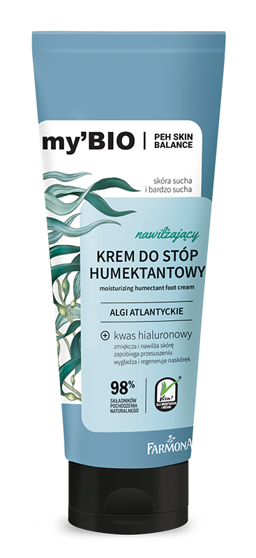 Nawilżający krem humektantowy do stóp myBIO to kosmetyk do suchej i bardzo suchej skóry stóp. Jego humektantowa formuła zawiera 98% naturalnych składników roślinnych, które nawilżają, wygładzają i regenerują naskórek. Niwelują także uczucie przesuszenia i dyskomfortu. W kremie obecny jest ekstrakt z alg atlantyckich, trzy rodzaje humektantów: kwas hialuronowy, Hydromanil, Hydrafeel-3 oraz niezbędne dla ich poprawnego działania emolienty. Skład uzupełniają m. in. olej z nasion słonecznika, oliwa z oliwek, gliceryna, masło shea i witamina E. Kosmetyk posiada niezwykle lekką formułę, głęboki wielowymiarowy zapach i ekspresowo stapia ze skórą. Z uwagi na to polecany jest wszystkim zniecierpliwionym, którzy nie lubią albo nie mają czasu czekać, aż produkt się wchłonie.