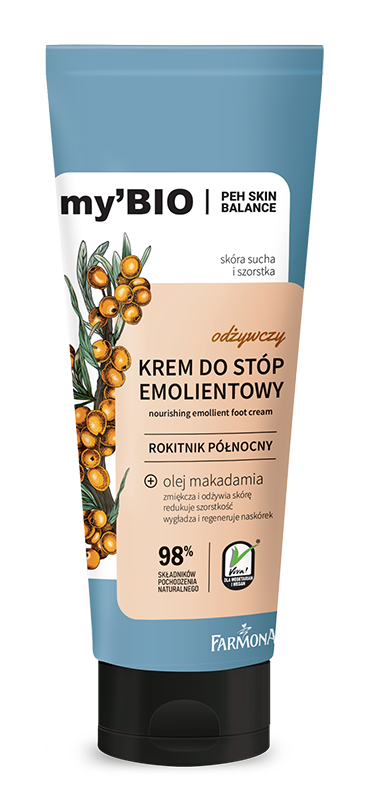 Odżywczy krem emolientowy do stóp myBIO dedykowany jest skórze suchej i szorstkiej. Jego emolientowa formuła zawiera 98% naturalnych składników roślinnych, które odżywiają, zmiękczają, wygładzają i widocznie regenerują naskórek. W kremie połączono niezwykle silne emolienty: olej makadamia, olej kokosowy oraz olej ze słodkich migdałów z wyjątkowo cennym ekstraktem z rokitnika północnego. Skład uzupełniają gliceryna, inulina, kwas mlekowy i witamina E. Kosmetyk posiada otulającą konsystencję i już od pierwszej aplikacji niweluje uczucie przesuszenia, napięcia i dyskomfortu. Polecany jest szczególnie tym, którzy potrzebują otulenia i kochają bogate formuły, a pielęgnacja to dla nich codzienny, wspaniały rytuał.