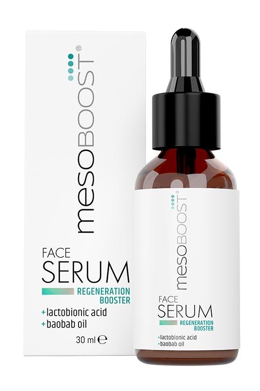 Intensywnie regenerujące serum do twarzy mesoBoost REGENERATION BOOSTER z kwasem laktobionowym i olejem z baobabu przeznaczony jest szczególnie do skóry suchej, szorstkiej, z zaburzoną barierą hydrolipidową oraz wrażliwej. Doskonale sprawdzi się także po zabiegach kosmetologicznych i dermatologicznych. Optymalne połączenie składników aktywnych przyspiesza procesy regeneracji naskórka, zapewnia długotrwałe nawilżenie oraz wzmacnia naturalną barierę ochronną skóry, pozytywnie wpływając na poprawę napięcia i elastyczności skóry. Dzięki lekkiej konsystencji łatwo się wchłania i lepiej dociera do głębszych warstw naskórka. Sposób użycia: Nałóż dozę serum na skórę twarzy i szyi. Następnie wmasuj opuszkami palców. Preparat należy stosować 2 razy dziennie (rano i wieczorem) pod krem mesoboost.