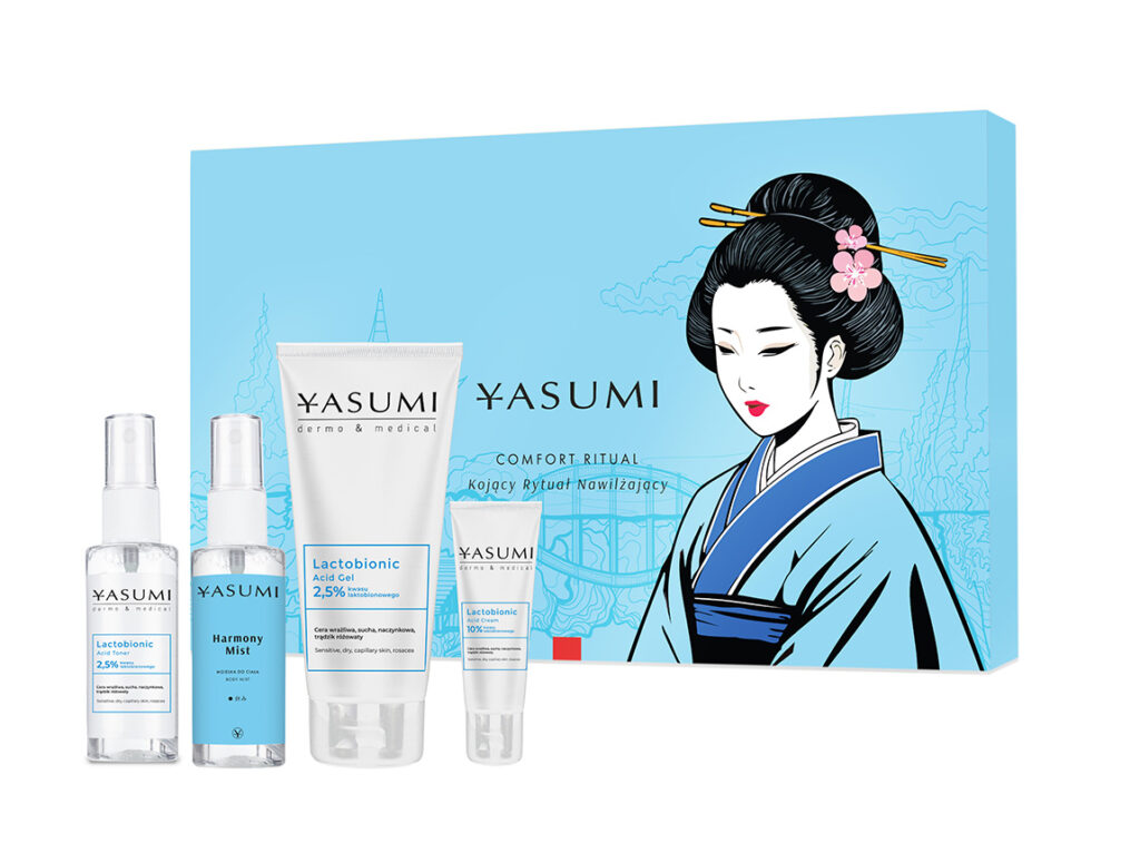 Yasumi Comfort Rituals Box to zestaw mini kosmetyków do delikatnej pielęgnacji cery wrażliwej, naczynkowej i spragnionej ukojenia. Formuła z kwasem laktobionowym i ektoiną łagodzi podrażnienia, wycisza zaczerwienienia i przywraca skórze upragnioną równowagę. W boxie znajdziesz: